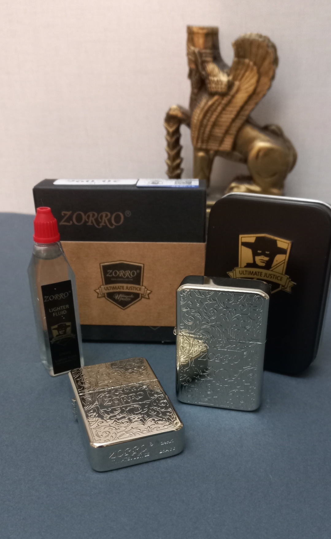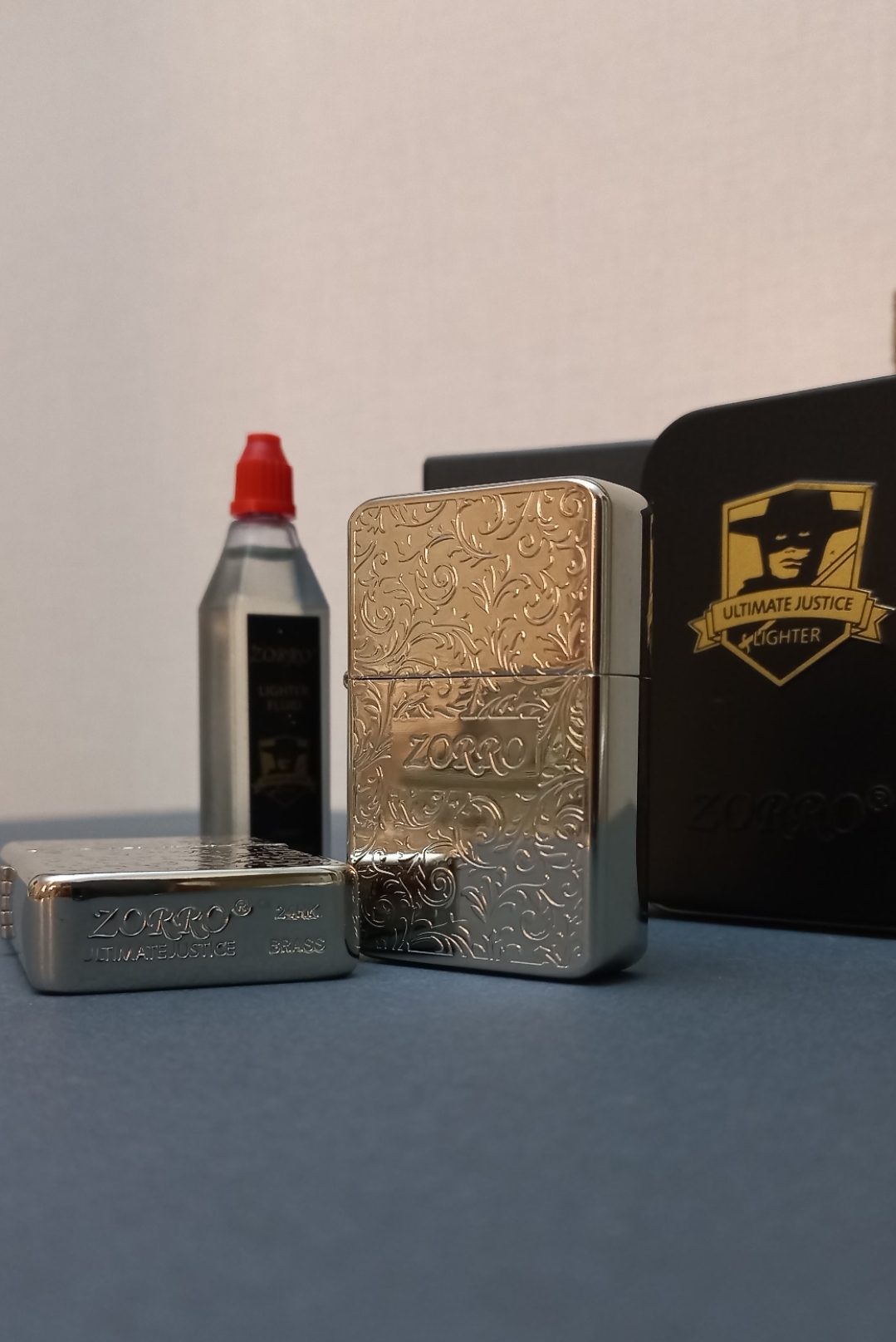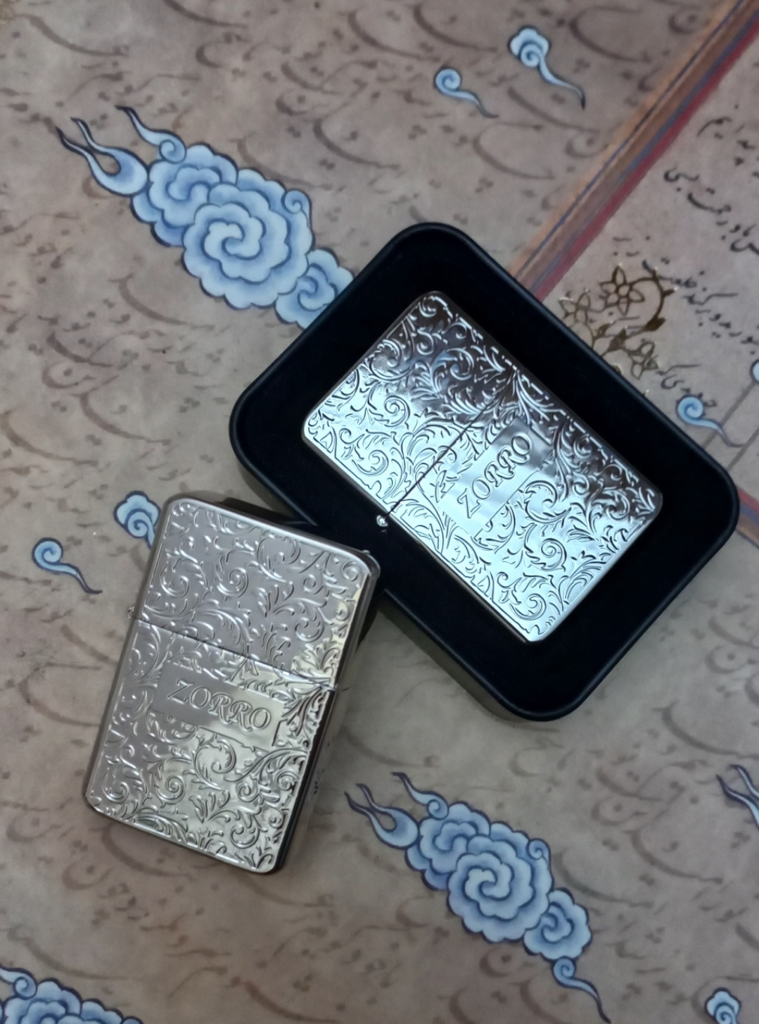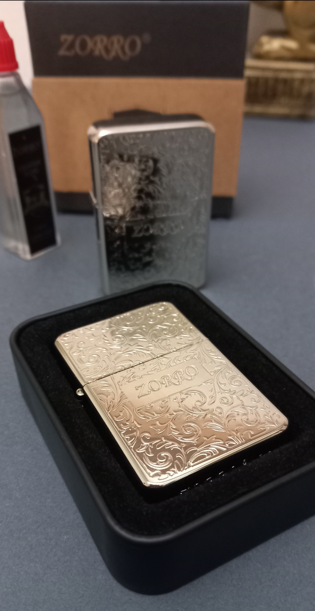 فندک بنزینی برند زورو مدل رپلیکا بدنه برنجی دوطرف حکاکی همراه با جعبه فابریک فلزی، بنزین، کاتالوگ و کاورجعبه