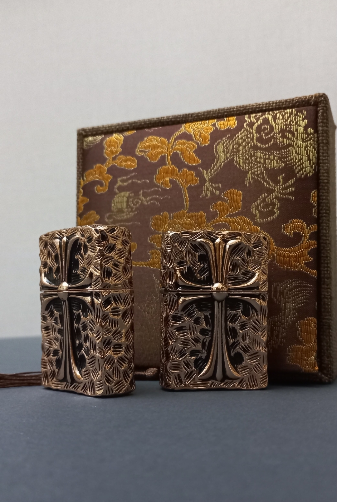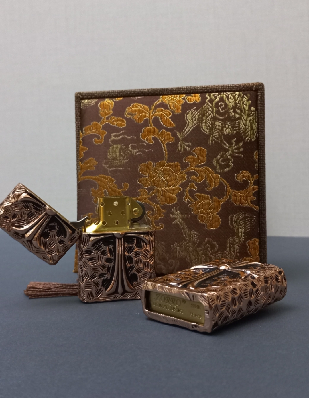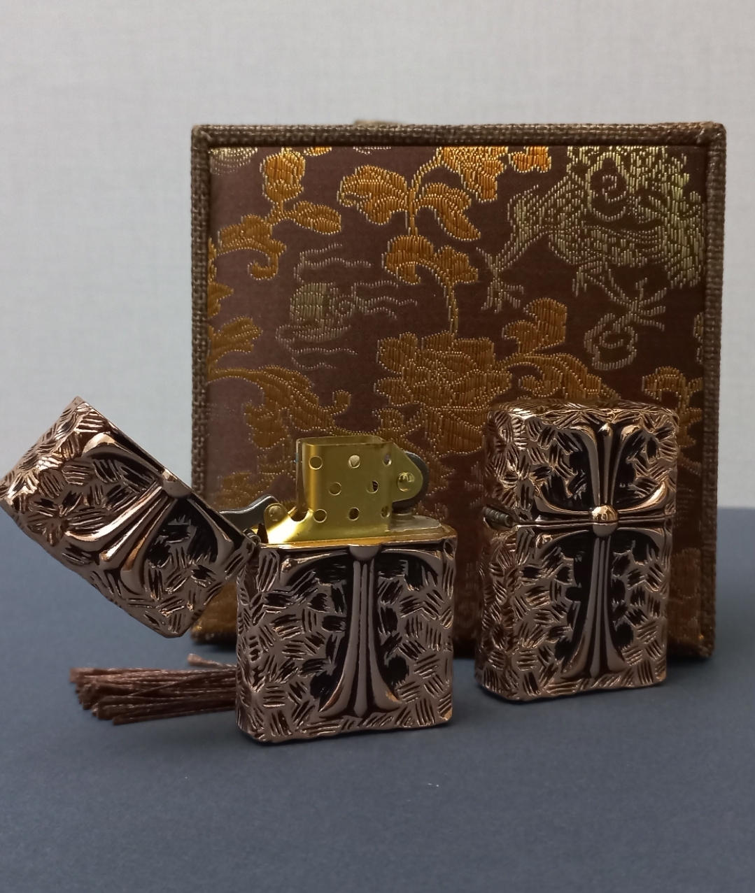 فندک بنزینی برند زورو ZORRO سنگین، تمام برنج، مغزی طلایی، طرح صلیب برجسته چکش کاری شده همراه با جعبه شکیل، کاتالوگ