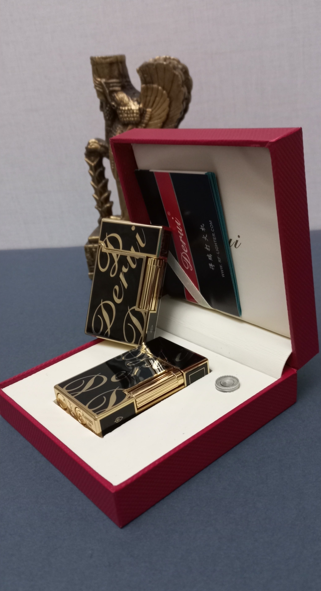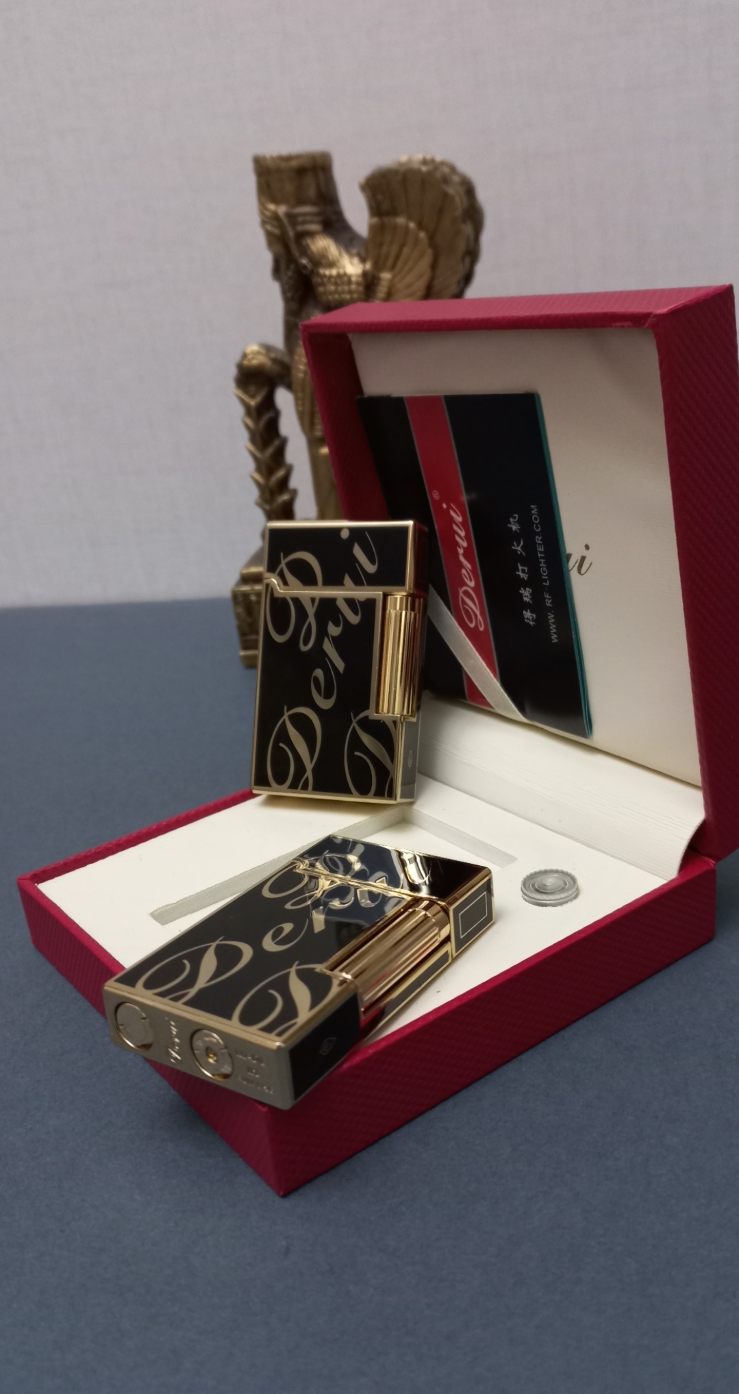 فندک گازی طرح دوپونت Derui طرح دوپونت لاین دو بدنه فلزی، مدل چرخ بغل همراه با جعبه فابریک، پک سنگ زاپاس، کاتالوگ و کاورجعبه